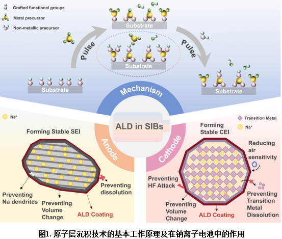 钠离子电池(SIBs)由于钠资源丰富且成本低廉,被认为是锂离子电池的可持续替代品。然而,钠离子(Na⁺)的离子半径更大、质量更高,这导致其在电极材料中的嵌入动力学缓慢,从而导致电池能量密度低、反应动力学迟缓、循环寿命短及安全隐患,亟待技术突破。 原子层沉积(ALD)技术以其独特的纳米级精度调控能力,为突破SIBs性能瓶颈开辟了创新路径。其核心自限制反应特性,能够在电极表面构筑高度均一、超薄的功能性涂层。这一设计巧妙兼顾多重效益:在显著降低无效质量、提升能量密度的同时,更能通过精准的纳米结构有效加速离子传输、强力抑制电极体积膨胀及副反应,从而大幅提升电极的结构与界面稳定性。近年来,ALD在SIBs领域的应用呈现迅猛发展态势,尤其在正极优化方面取得显著成果,但系统性研究的深度与广度仍有待拓展。本文深度聚焦ALD涂层与电极材料间的关键作用机制,系统解析了该技术在负极、正极、电解质中的前沿创新应用,并前瞻性探讨其面临的核心技术挑战与商业化前景,旨在为钠离子电池技术的加速发展注入强劲创新动能。 福州大学材料科学与工程学院23级硕士生张天柱为该论文的第一作者。福州大学材料科学与工程学院、新能源材料与工程研究院为第一单位。论文得到福州大学郑云教授、颜蔚教授和张久俊院士的共同指导。获得国家自然科学基金外国学者研究基金项目( 文章信息:T. Zhang, T. Wang, Y. Zheng, L. Qian, X. Liu, W. Yan, J. Zhang, Atomic Layer Deposition for Sodium-ion Batteries, Adv. Energy Mater., 2025, e01760. 文章链接:https://doi.org/10.1002/aenm.202501760