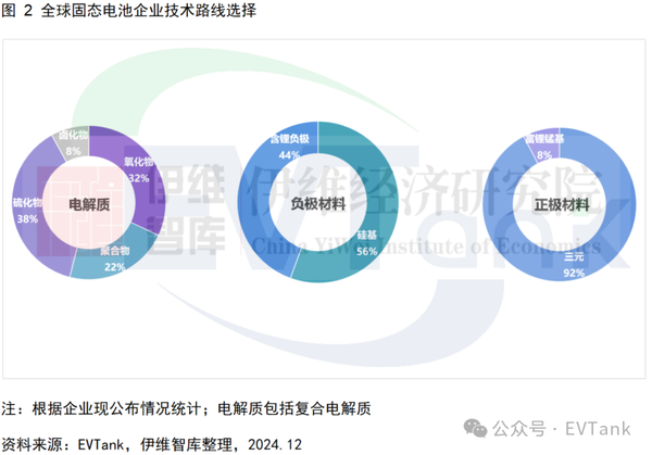 从电池企业选择的技术路线来看,EVTank指出,全球固态电池企业布局呈现百花齐放的格局。在电解质选择方面,硫化物技术仍是更多企业(38%)的远期路线选择,其次为氧化物路线(含复合路线)占37%。负极材料方面,硅基负极和含锂金属负极是当前固态电池的主要材料,在更高能量密度固态电池上主要选择锂金属负极。正极材料方面,目前以高镍三元为主导,未来将逐步向更高比能富锂锰基发展。